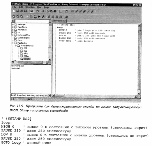 > Строка 1. Программа сообщает редактору о типе используемого микроконтроллера BASIC Stamp. В данном случае это BASIC Stamp 2, что и зафиксировано в строке кода {$STAMP BS2}. > Строка 2. Этот операнд называется меткой (label). Он используется здесь и в конце программы для образования бесконечного цикла > Строка 3. Операнд HIGH о переводит вывод 0 микроконтроллера в состояние с высоким уровнем напряжения. Вследствие того, что светодиод подключен именно к этому выводу, он зажигается. > Строка 4. Команда PAUSE 250 предписывает микроконтроллеру ждать в течение интервала 250 мс. Как вы помните, 1 миллисекунда — это одна тысячная секунды, следовательно, 250 миллисекунд составляет 250/1000 или четверть секунды. > Строка 5. LOW 0 переводит вывод 0 микроконтроллера в состояние с низким уровнем сигнала, светодиод выключается. > Строка 6. Следующая команда PAUSE 250 снова заставляет микроконтроллер подождать 250 миллисекунд. > Строка 7. Операнд GOTO с аргументом loop предписывает микроконтроллеру BASIC Stamp перейти к метке под соответствующим названием (loop) в тексте программы. Именно эта команда заставляет программу снова и снова возвращаться по циклу, и так до тех пор, пока никто не перепрограммирует микроконтроллер другой программой.