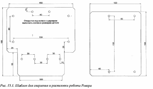 Сначала был шаблон Если в более простых проектах, изложенных в нашей книге ранее, все начиналось с принципиальной схемы, как, например, в главе 14, то на этот раз мы постепенно эволюционируем к шаблону для сверления и распиловки. Такой шаблон (или форма) служит основой всего робота, и от него мы будем отталкиваться в дальнейшем. Лучше будет, если вы нарисуете шаблон на плотной бумаге в масштабе 1:1. Примерный шаблон для сверления и распиловки для Ровера показан на рис. 15.1. Робот, как видите, будет иметь двухуровневую структуру. Все размеры на рисунке приведены в миллиметрах.
