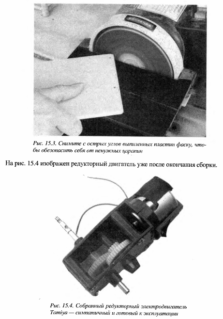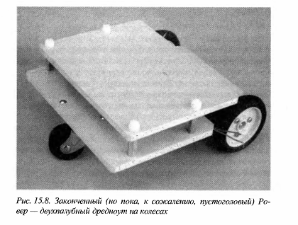 Верхом на Ровере Надежно прикрепив оба электродвигателя к конструкции робота, можно начинать устанавливать колеса. Колеса, естественно, нужно закрепить на осях моторов. Небольшие электродвигатели для разных механических и электронных безделушек часто уже имеют оси в комплекте, но нужно знать, что они бывают двух типов: с отверстием на конце и без него. Эти отверстия предназначены для цилиндрических штифтов, с помощью которых и происходит крепление. Будьте внимательны — эти штифты очень маленькие и их легко потерять; а поставляются они в комплекте с моторчиками, так что купить их отдельно весьма проблематично. Понятно, что штифты используются для крепления деталей (в данном случае — колес) на тех осях, где имеются отверстия под них. Если в комплекте было сразу две оси под колеса, то вторую можно пока бросить в ящик с запасными деталями — кто знает, может быть вскоре понадобится и она. Колеса для робота можно подобрать и самостоятельно, но что касается авторов, то мы выбрали вполне определенные — из набора с узкими шинами (Narrow Tire set, номер 70145 по каталогу Tamiya), которые имеют диаметр 58 мм и оснащены небольшими резиновыми ободами (шинами). В комплекте с этими колесами сразу поставляются и втулки, которые позволяют закрепить колеса на валу электродвигателя. Колесо располагается на оси и закрепляется при помощи специальной шестигранной гаечки — она также входит в набор. Вообще — сами по себе колеса также представляют готовый для сборки комплект со всеми необходимыми деталями, поэтому можно пользоваться прилагающейся к нему инструкцией. После окончания сборки первого мотора и колес соберите второй, который должен представлять собой точную копию первого. Прикрепите оба электродвигателя к нижней деке робота, используя пару винтов и гаек соответствующего размера, например, МЗ длиной около 10 мм. Как должна выглядеть механическая часть робота после окончания сборки, показано на рис. 15.6