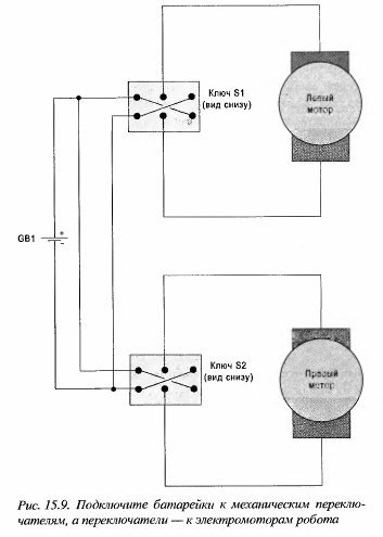 2. Припаяйте выводы отсека для батареек (на четыре батарейки типа АА) к двум из оставшихся четырех выводов переключателей. Красный и черный провода от отсека с батарейками должны быть подключены сразу к обоим электромоторам, как и показано на рис. 15.9.