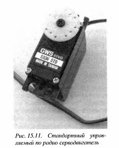 Обычные моторы - прочь, радиоуправляемые сервомоторы - сюда Перед тем как запрограммировать микроконтроллер, нужно еще немного довести до ума механическую часть робота: для того, чтобы использовать электронное управление, нужно заменить моторы нашего робота. Ровер, которого мы собрали в первой части этой главы, имел два обычных редукторных электромотора постоянного тока. Такие двигатели отлично работают при управлении роботом с помощью механических переключателей, когда оператор изменяет полярность питания, щелкая тумблерами. Однако редукторные моторы приходится дорабатывать, чтобы они справлялись с электронным управлением. Если быть более точным, для их работы нужен так называемый Н-образный мост, который выполняет ту же работу, что и оператор при помощи механических ключей для нашего первого Ровера. Обещаем — вам не придется покупать или собирать самостоятельно Н-мосты; вместо этого мы используем в нашем новом проекте пару не слишком дорогих (около 10 долл. каждый) серводвигателя. Это не простые моторы — они будут управляться по радио, и используются, например, в авиамоделировании. С такими электродвигателями микроконтроллер может управляться и без какой-либо вспомогательной схемотехники. Типичный радиоуправляемый серводвигатель показан на рис. 15.11 внизу.