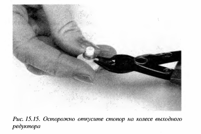 8. Аккуратно удалите стопор с верхней стороны колесика выходного редуктора при помощи кусачек (рис. 15.15) или бритвенного лезвия.