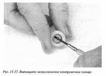 10. Снимите при помощи небольшой отвертки металлическое контровочное кольцо с оси зубчатого колеса выходного редуктора (рис. 15.17).