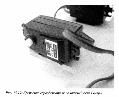 Лично мы предпочитаем использовать двухстороннюю липкую ленту Velcro или ей подобные. Ленту, которая будет скреплять между собой детали робота, можно купить практически в любом магазине. Наклейте ее на боковую сторону серводвигателя, а потом крепко прижмите мотор к нижней деке робота. На рис. 15.19 показано, как должна выглядеть конструкция после монтажа двигателя.