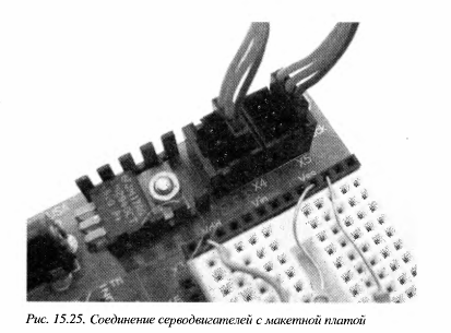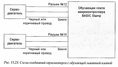 Соединение робота с макетной платой Итак, настоящий "умный" робот почти готов! Теперь осталось лишь подключить уже установленные серводвигатели к микроконтроллеру BASIC Stamp в составе обучающей платы. Общую схему соединений можно проверить по рис. 15.23.