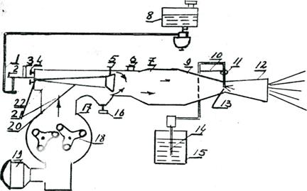 Аэрозольный генератор с двигателем А-6 был предложен Степановым. Генератор впоследствии был модернизирован получил марку АГ-УД-2 (аэрозольный генератор с двигателем УД-2). Аэрозольный генератор предназначен для обработки с помощью аэрозолей садовых и лесных насаждений, полевых культур, а также амбарных и животноводческих помещений. Аэрозольный генератор работает на термомеханическом принципе. Производительность генератора при образовании аэрозолей из масляных растворов — 9 л/мин, при распылении водных растворов дезинфицирующих средств — 6 л/мин. Длина факела — 5...10 метров. Вместимость резервуара 200 литров. Генератор устанавливается на тракторную тележку, грузовую платформу самоходного шасси пли кузов автомобиля. Генератор (рис. 3.1) состоит из бензинового двигателя УД-2 мощностью 8 л.с., воздушного нагнетателя 18 марки ЯМЗ-204, камеры сгорания 22 с бензиновой горелкой, жаровой трубы и рабочего сопла 12. В рабочем сопле расположен жиклер 13 для подвода распыляемой жидкости. Количество подаваемой жидкости регулируется с помощью крана 11, имеющего дистанционное управление 10. Для воспламенения бензиново-воздушной смеси генератор имеет запальную свечу 16. Ток к запальной свече подается от магнето. При работе двигателя получает вращение нагнетатель воздуха. Воздух через фильтр 19 нагнетателем 18 под избыточным давлением 19,6 кПа (0,2 кг/см2) подается в камеру сгорания 21. Часть этого воздуха поступает в бензиновую горелку, распыляет бензин, а остальной воздух проходит в щель между диффузором горелки 20 и горловиной камеры. Образовавшаяся горючая смесь поджигается за счет искры, проскакивающей между электродами свечи. Продукты сгорания смешиваются с избыточным воздухом и получившаяся газовая смесь с температурой 380... 580 °С поступает в рабочее сопло. В рабочем сопле за счет сужения скорость потока смеси увеличивается до 200 м/с. Здесь расположен жиклер 13, через который всасывается рабочая жидкость, состоящая из минерального масла (дизельного или другого топлива) и ядохимикатов. В сопле происходит механическое распыление жидкости струей горячего газа, а также испарение капель в потоке горячего газа. После выбрасывания паров в атмосферу происходит конденсация их в капельки аэрозоля. Степень распыления жидкости и иную с этим дисперсность можно изменять, регулируя температуру газов подачей бензина и рабочей жидкости. При пуске генератора надо открывать кран подачи рабочей жидкости несколько позже начала загорания бензина в камере чтобы установилась достаточная для испарения температура. При остановке машины надо обязательно сначала прекратить подачу рабочей жидкости, затем бензина, и через одну-две минуты прекратить подачу воздуха. Если раньше прекратить подачу бензина или дутье, то рабочая жидкость будет продолжать поступать на горячие стенки сопла и может воспламениться. Для мелкокапельного опрыскивания без испарения рабочей жидкости вместо жаровой трубы с соплом устанавливают специальную угловую посадку с жиклером. В этом случае жидкость испаряется холодным воздухом, подаваемым воздуходувкой. Наибольший расход рабочей жидкости 10 литров в минуту, расход бензина 12 килограммов в час.