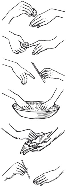 4. Смягчение рук. Эта процедура необходима для смягчения кожи перед обработкой кутикулы. Руки на определенное время опускают в емкость с теплой мыльной водой. Эта процедура необходима для смягчения кожи вокруг ногтя. 5. Вытирание рук. Маникюр ни в коем случае нельзя делать на мокрых руках. Их необходимо вытереть чистым полотенцем. 6. Чистка ногтей. Данная операция необходима не только для красивого внешнего вида ногтя, но и для его здоровья. Очистка ногтя от заусенцев, ороговевшей надкожицы открывает доступ к нему кислорода. В противном случае ноготь не получает должного питания, портится его структура и замедляется рост. Для обеспечения более легкой и безболезненной процедуры удаления кутикулы на нее наносится специальная жидкость и масло для питания ногтей. Действие жидкости состоит в том, что околоногтевая кожица сворачивается, становясь незаметной. По истечении 5–7 минут кожу вокруг ногтя надо отодвинуть тупой лопаткой. Обычно используют палочки либо из апельсинового дерева, либо специальные, напоминающие карандаш пемзочки.