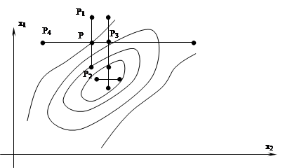 Прежде чем излагать метод релаксации, рассмотрим вопросы терминологии. Слово "релаксация" (ослабление) часто употребляется для определения класса итерационных алгоритмов при решении систем линейных уравнений. Этот класс методов характеризуется последовательным сведением к нулю наихудшего из остатков, соответствующего какому-либо линейному уравнению. Существует несколько методов релаксации: координатная, блочная, групповая и сверхрелаксация. Последнее определение применяется к такому релаксационному процессу, когда вместо полной ликвидации остатка в одном из уравнений осуществляется уменьшение абсолютного значения этого остатка. В некоторых случаях под релаксацией понимают область искусства по решению систем линейных уравнений с привлечением различных вычислительных приемов. В ряде работ по нелинейному программированию под релаксацией подразумеваются методы решения экстремальных задач, обеспечивающие максимализацию целевой функции. В дальнейшем будем придерживаться следующего определения метода релаксации, имеющего наибольшее распространение при современном изложении нелинейного программирования: "метод, при котором следующая точка отличается от текущей значением только одной компоненты, называется релаксационным" [3]. Данное определение наиболее удачно отражает характерные черты тех релаксационных методов, которые успешно применялись при решении систем линейных уравнений еще со времен Гаусса. Последовательность вычислений для случая двух переменных методом релаксации, основанном на покоординатной минимизации критериальной функции, состоит в следующем: 1. В точке Р(х1, х2) с координатами, равными среднему арифметическому из координат исходных пунктов, вычисляем значение целевой функции Фj, полагая j = 1. 2. Учитывая опыт работы, задаем начальное значение шага релаксации lj = Sср. / 3, где Sср. ¾ средняя длина стороны в геодезической сети. 3. Вычислим значения целевой функции в четырех точках релаксации 4. Если Фj £ Фmin, то lj уменьшают вдвое и возвращаются к п.3, предусматривая регулировку шага релаксации по принципу дихотомии. 5. От точки Рj перейдем к точке Рi (i = 1, 2, 3, 4) с наименьшим значением целевой функции. В результате получим новую точку Траектория минимизации по методу релаксации изображена на рис. 2.4.