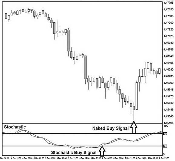 Рисунок 2.6. Часовой график валютной пары EUR/USD. Сравнение голого сигнала на покупку с сигналом на покупку по стохастикам. Традиционный стохастический сигнал формируется точно перед падением рынка. Голый трейдер получает сигнал к покупке на уровне разворота.