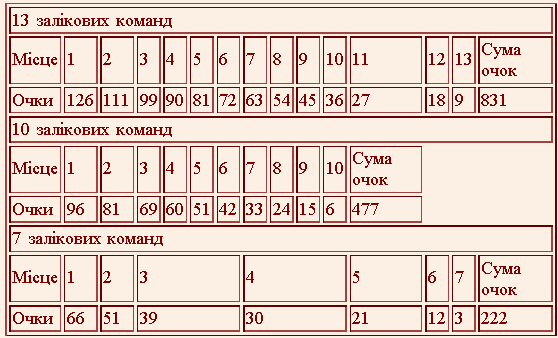При проведенні особисто-командних та командних змагань результати команди можуть визначатися по кращій сумі очок, яку набрали учасники команди у певному виді програми даної групи. Згідно до "Правил змагань зі спортивного орієнтування" нарахування очок може здійснюватися відповідно до таблиць 2.3. Допускається, якщо зазначено у положенні, нарахування по 1 очку всім учасникам, які посіли місця після залікових. Аналогічним чином визначаються залікові очки для естафетних команд в три етапи (таблиця 2.4.). У випадку, коли команди пройшли тільки два або один етап, кількість очок зменшується відповідно на 1/3 або на 2/3. Таблиця 2.4. Нарахування очок для команд за результатами естафети