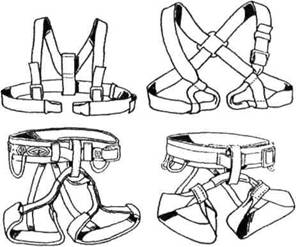 На дистанціях змагань зі спортивного туризму дозволяється використовувати будь-які стандартні страхувальні та саморобні системи, допущені технічною комісією. Елементи страхувальних систем, які несуть навантаження, повинні виготовлятись з капронової стрічки шириною не менше 3,5 см. Всі елементи і матеріали страхувальної системи (стрічки, пряжки, шви), які несуть навантаження, повинні мати міцність, рівноцінну міцності основної мотузки. Ділянки, які зшиваються, повинні мати розмір не менше подвійної-потрійної ширини стрічки з розташуванням швів у напрямку основних навантажень. Зшивати стрічки рекомендується капроновими нитками № 10. Колір швів повинен бути контрастним до кольору стрічки, щоб можна було контролювати цілісність та ступінь пошкодження шва. Рекомендується зшивати стрічки швом "зигзаг", який мало деформується під дією зовнішніх навантажень, будь-якого напрямку. Металеві частини системи повинні мати радіус заокруглення країв 2-3 мм. Якщо елементи системи з'єднуються за допомогою пряжок, то стрічка, яка входить в пряжку, повинна обов'язково проходити через ту саму пряжку в зворотному напрямку, щоб запобігти самовільному роз'єднанню системи під час руху.