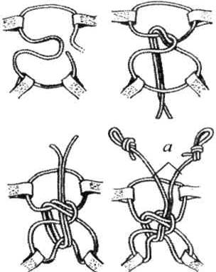 Рис. 3.3. Блокування страхувальної системи вузлом подвійний булінь; а - "вуса" для самострахування