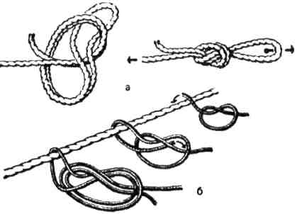 Рис. 3.14. Вузол "провідник": а - в'язання петлею, б - в 'язання одним кінцем