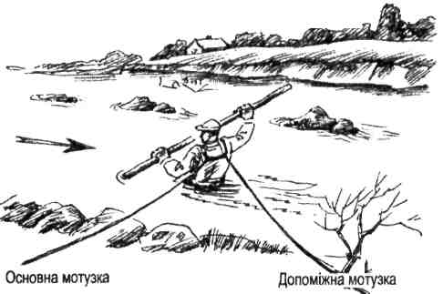 Лінія руху вибирається під тупим кутом до течії для того, щоб зменшити силу тиску течії на людину. Мотузки на березі необхідно тримати якомога вище, оскільки, потрапляючи у воду, вони створюють додаткове обтяження, що діє на учасника. Знесеного течією утримують на основній мотузці, одночасно підтягуючи до берега допоміжною. Тому страхуючі з допоміжною мотузкою розташовуються на березі нижче за течією від основної мотузки. Страховка через плече і поперек при переправах не рекомендується, бо доводиться то швидко відпускати мотузку, то вибирати, тому два-три чоловіка просто тримають її в руках. Мотузку намагаються тримати так, щоб вона по можливості довше не торкалася води. Якщо є необхідність швидко видати мотузку тому, хто переправляється, частину намотаної кільцями мотузки викидають проти течії. Поки її натягне течією, той, що переправляється, встигне зробити стрибок або пропливти небезпечну ділянку. При зриві того, хто переправляється, іноді доводиться бігом рухатися берегом, тому що туго натягнута основна мотузка може заважати триматися над водою. При цьому дуже важлива погодженість дій тих, хто страхує основною і допоміжною мотузками. Поки перші дають можливість плисти тому, хто переправляється по течії, другі повинні підтягувати його до берега. Одиночна переправа вбрід по перилах. Перила робляться із основної мотузки, яка закріплена на двох берегах (рис. 4.2). Способи кріплення мотузки розглянемо у пункті "Навісна переправа". Для більшої стійкості перил можна на кожному березі біля точки фіксування перил зробити відтяжки з двох мотузок, що розходяться під кутом 60-90°. Перший учасник переправи, який перейшов річку, закріплює на березі мотузку, яка буде для інших учасників служити перилами. Ті, що переправляються, обв'язуються грудною обв'язкою, прикріплюються карабіном до поручнів та, тримаючись за них руками, переходять річку стоячи обличчям до течії. Останній учасник переправи знімає поручні, обв'язується основною мотузкою і ті, що знаходяться на протилежній стороні, витягують його. Але краще, коли і він переправляється по перилах, які потім, так само як і навісна переправа, легко знімаються з іншого берега.