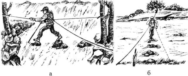 Рис. 4.8. Переправа по камінню: а - з використанням перил; б - положення страхувальної мотузки відносно каменів