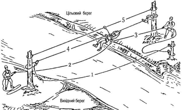Рис. 4.16. Навісна переправа через річку 1 - допоміжна мотузка, 2 - супроводжуюча мотузка, 3 - транспортна мотузка, 4 - основна мотузка, 5 - судівська страховка