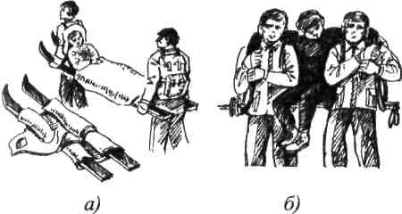 Рис. 4.27. Транспортування потерпілого удвох (а - на жердинах чи лижах зі штормівками; б - на поперечних палицях)