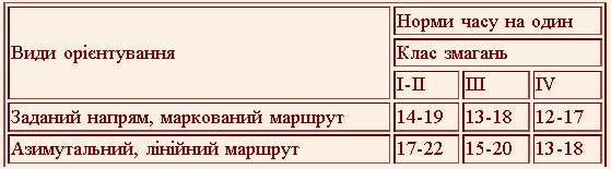 Залік з топографії та геодезії. Учасники команди виконують завдання, пов'язані з роботою по топографічній карті, малюванням та розшифровкою знаків, визначенням азимуту або напрямку руху, визначенням відстані по картах, схемах, кроках різних масштабів і т. ін. Рекомендується до виїзду команд на змагання повідомити їх про джерело інформації, відповідно до якого буде проводитися суддівство. Топографічні знаки, зразки карт рекомендується вивішувати до початку змагань. Визначення відстані до об'єкта або висоти об'єкта. Визначається відстань від точки знаходження до недоступної точки (наприклад, на іншому березі річки, озера). Біля точки знаходження повинен бути вільний простір дистанції для замірів. Рекомендується відстань не більше як 40 м. Точність 100%. Встановлення намету. Як правило, команди встановлюють намет "класичної" конструкції - двоскатний будиночок. Етап проводиться відповідно до Умов проведення змагань. Рекомендується для дистанції І класу. Розпалювання багаття. Для об'єктивного оцінювання етап організовується наступним чином. По різні сторони місця, де учасники будуть розпалювати вогнище, встановлюються два металевих прути. Між ними на висоті 20-30 см від землі натягується дріт (щоб не перегорів, краще сталевий), вище якого на висоті 10-15 см натягується товста нитка. До старту команди готують багаття-розміщують хмиз, гілочки, дрова до дроту. Після старту запалюється багаття. При перегоранні нитки етап вважається закінченим. Рекомендується для дистанції І класу. Орієнтування. Всім туристам потрібні навички орієнтування на місцевості. На відміну від спортивного орієнтування тут використовуються різні вправи, за допомогою яких перевіряються навички користування компасом, картою, визначення сторін горизонту, напрямку руху тощо. На змаганнях зі спортивного туризму вправи з орієнтування на місцевості можуть бути включені до дистанції "Крос-похід", або можуть проводитись окремою дистанцією. Дистанція може включати декілька видів орієнтування на місцевості: - рух по заданому азимуту і карті; - рух в заданому напрямку по карті з проходженням через контрольні пункти; - орієнтування по маркованому маршруту; - визначення місця знаходження методом засічок; - рух по заданому азимуту і відстані; - рух без карти по "легенді"; - рух по лінії, позначеній на карті. На етапах орієнтування можуть використовуватися топографічні, спортивні карти, тощо. На етапах орієнтування визначення встановленого (оптимального) часу рекомендується проводити відповідно до приблизних норм часу на один кілометр шляху (табл. 4.4). Таблиця 4.4