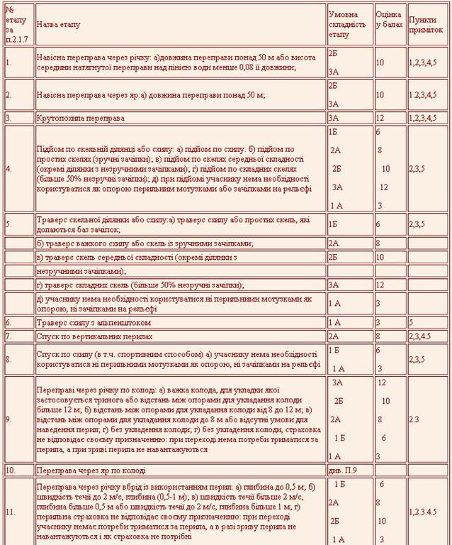 Примітки: 1. Додатково за перехід першого учасника даються такі бали: 0 - якщо за Умовами перший учасник проходить без страховки або по суддівських перилах; 1 - перший учасник проходить на самостраховці (жердина, льодоруб і т. і.) або з командною страховкою при імітації перешкод; 3- перший учасник проходить з командною страховкою. 2. Можливе використання коефіцієнта У= 1,2 при ускладнених умовах роботи на етапі (наприклад, відсутність площі при наведенні переправи, переправа знизу вгору і т. і.). 3. За автономність роботи на етапі вводяться наступні коефіцієнти: А = 0,8 - якщо етап обладнаний суддівською страху вального супроводжуючою мотузкою; А-0,5 - якщо на етапі суддівські перильні (для спуску, підйому переправи і т. і.) мотузки; А-0,3 - якщо весь етап підготовлений суддями; А=1,0 - якщо весь етап наводиться силами команди. 4. Якщо етап проходиться з "потерпілим", то застосовується коефіцієнт 17=1,2 (крім етапів передбачених п.15). 5. Вказані в таблиці бали застосовуються при протяжності етапу (мотузки) від 20 м до 30 м. В інших випадках використовуються коефіцієнти: L=0,8 - якщо протяжність менше 20 м; L =1,2 - якщо протяжність від 30м до 40м; L= l,5 - якщо протяжність більше 40 м. 6. Коефіцієнти У, A, L застосовуються як для основних балів оцінки етапу, так і для додаткових згідно п. 1 7. Розрахунок оцінок етапів з урахуванням усіх коефіцієнтів проводиться з точністю до 0,1 бала. 8. Всі етапи умовно поділяються на локальні перешкоди (1-18), спецзавдання (20-27) та протяжні перешкоди (19). Проходження відстані від виконання завдань по орієнтуванню балів не додає. 9. Вказана в таблиці складність етапу відповідає тільки повністю автономній роботі команди. Ті етапи, які не відповідають за технічними параметрами опису розділу 2, не мають умовної складності етапу та оцінки у балах. Date: 2015-09-26; view: 442; Нарушение авторских прав |