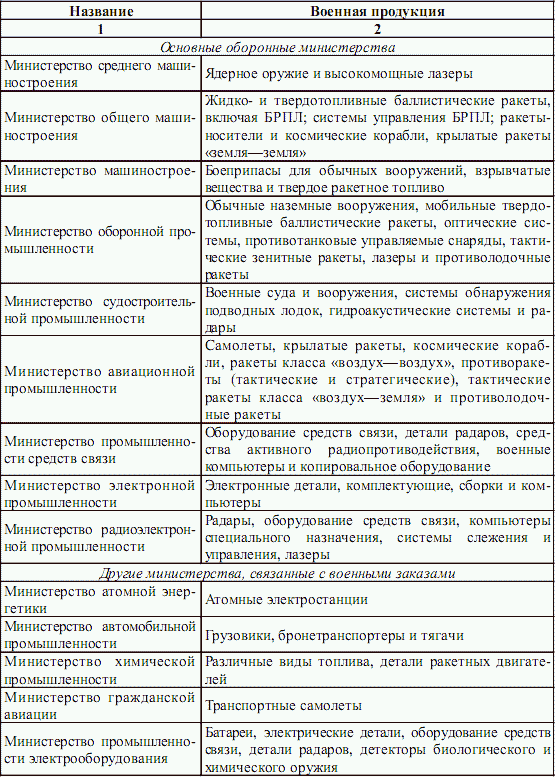 Министерство общего машиностроения (Минобщемаш) занималось производством баллистических ракет и космических кораблей, крупных ракет «земля–воздух», крылатых ракет. Оно имело четыре главных управления, осуществляющих производство наземного оборудования (стартовых и испытательных сооружений), ракетных двигателей, систем управления и самих ракет. Министерство машиностроения (Минмаш) отвечало за производство обычного военного снаряжения. Министерство оборонной промышленности (Миноборонпром) отвечало за разработку и производство сухопутных вооружений и боеприпасов. Министерство судостроительной промышленности (Минсудпром) отвечало как за военный, так и за гражданский флот. Министерство авиационной промышленности (Минавиапром) занималось производством самолетов и комплектующих к ним, ракет «воздух–воздух» и «воздух–земля», осуществляло руководство многочисленными исследовательскими организациями, включая Центральный аэрогидродинамический институт (ЦАГИ) и ЦНИИ авиационного моторостроения (ЦИАМ). В структуре Минавиапрома находились восемь авиационных КБ и семь КБ, занимавшихся разработкой ракет. Министерство радиопромышленности занималось производством радиоэлектронных систем, радаров, компьютеров и др. Министерство промышленности средств связи отвечало за производство электронных систем, радио– и телевизионных приемников, телеграфного и телефонного оборудования, антенн, спутников и компьютеров для военных и космических приложений. Министерство электронной промышленности занималось производством полупроводниковых приборов и микроэлектронных компонентов, разработкой радаров противоракетных систем, компьютеров и др. Конструкторские бюро разрабатывали системы вооружений, действуя под эгидой соответствующих министерств. Существовало несколько основных КБ, осуществлявших разработку межконтинентальных баллистических ракет (МБР). Для удобства они были названы по имени главных конструкторов – С.П. Королева (ОКБ‑1), М.К. Янгеля (ОКБ‑5861), В.Н. Челомея (ОКБ‑52) и А.Д. Надирадзе (Московский институт теплотехники). Конструкторское бюро Янгеля находилось в Днепропетровске, В.Н. Челомея – в Москве. Они занималось как баллистическими, так и аэродинамическими (крылатыми) ракетами. Конструкторское бюро Надирадзе, занимавшееся твердотопливными ракетами, также находилось в Москве. Конструкторское бюро В.П. Макеева, расположенное в Челябинске, являлось основным по производству баллистических ракет морского базирования (БРПЛ). Работы в области создания ракет класса «земля–воздух» и противоракет много лет велись в конструкторском бюро П.Д. Грушина, а ракетами «земля–воздух» и крылатыми ракетами занималось КБ С.А. Лавочкина. Одним из ведущих конструкторов систем управления для ракет и самолетов был Н.А. Пилюгин, а В.П. Глушко (ОКБ‑456), A.M. Исаев (ОКБ‑2) и С.П. Изотов возглавляли в течение многих лет ведущие КБ по ракетным двигателям. Академик В.П. Бармин был главным конструктором ракетных пусковых установок. Военно‑промышленная комиссия (ВПК) осуществляла руководство деятельностью министерств оборонной промышленности и координировала ее. Государственный комитет СССР по планированию (Госплан) занимался планированием, финансированием и координацией экономики в целом. Требования военных по производству оружи