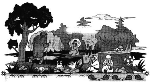 Были, правда, в мире мёртвых у бога Велеса, кроме добрых покровителей мирных пахарей, которые не хотели живым людям зла, и другие обитатели. Удалая Яга Виевна, хитрющая Велесова супруга, злым подземным жителям всячески покровительствовала. Да и сама она любила напакостить людям в мире Яви: то бурю в поле поднимет и все колосья к земле прижмёт, то в лесу устроит такой вихрь, что огромные ели просекой лягут, то своими длинными космами нагонит тучи и ураганы. Как вы помните, дорогие девочки и мальчики, дружила Яга с Мореной, богиней смерти и холода, и любила полакомиться человеческими душами, а потому имела дурную привычку красть детей из славянских посёлков, заманивать путников к себе в избушку, чтобы отдать их в руки Морены‑смерти, а та потом отдаст их души Яге. А мары с длинными распущенными волосами, слуги Морены, что помогли ей когда‑то усыпить Кощея Чернобоговича, и вовсе бродили вокруг людей беспрестанно, не давая им покоя ни зимой, ни летом. Говорили, что они обычно невидимы и носят свои головы под мышкой, насылают болезни, а по ночам стоят под окнами людских домов, шепчут имена домочадцев: если кто отзовётся на голос мары, умрёт тотчас. Бывало, что поселялись мары и в домах за печками, пряли там в лунные ночи чёрную пряжу, но не к добру это было, а к худым переменам в судьбе обитателей такой избы. По ночам из Велесова царства иногда приходили к людям навии – духи смерти, призраки умерших. Верхом на чёрных конях, волосатые и хвостатые, выскакивали они внезапно из‑под земли и носились по улицам, убивая всех, кто выходил из избы наружу, болезни‑лихорадки, несчастья и стихийные бедствия на людей насылали. Чтобы от навий уберечься, надо было в темноту сидеть по домам, или иметь специальный оберег, или надевать одежду с особой охранительной вышивкой. Некоторым только что рождённым младенцам могли навии поставить на теле невидимый «навий знак», и тогда жизни на земле ребёнку уже не будет. А в особый «навий день» эти страшилища невидимыми приходили из подземного царства в гости к своим потомкам на поминальную трапезу, и, чтобы умилостивить выходцев с того света, для них накрывали в доме богатый стол. А если думаешь победить навий, надо разрыть их могилу и вынуть особую «навью косточку». Были у навий и злобные прислужники, костлявые маленькие старички‑человечки, глухие, слепые и немые, но очень вредоносные. Их обычно так и называли – злыдни. Больше всего они любили вскакивать людям на спины и висеть невидимыми не слезая. Лихо и Горе‑Злосчастье приводили они за собой и, случалось, надолго вселялись в какого‑нибудь человека, делали его злобным и доводили до смерти. Но если им попадался человек сметливый, то он хитростью мог от злыдней избавиться: например, мог заманить вкусной приманкой внутрь какого‑нибудь горшка, а потом накрыть горшок крышкой. И уж оттуда злыдни выбраться никак не могли! И тогда начиналась у человека совсем другая жизнь, сытая и богатая, поворачивалось жизненное колесо, созданное отцом Сварогом, и, по закону великого Велеса, беды сменялись радостью. И славил человек премудрых богов. Тогда снова побеждало добро злые чары, и текла жизнь в нашем мире дальше – своим чередом. За зимой следовала весна, и приходило время просыпаться ярому сыну Велеса, богу Яриле. Этот бог не был тёмным и страшным, но обладал он неистовой плодород