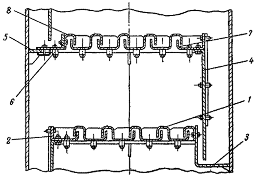 Тарелка из S – образных элементов На тарелках с s- образными элементами жидкость движется по направлению к сливному устройству поперёк колпачков. На этих тарелках желоба и колпачки образуются сборкой одинаковых по форме деталей ---S- образных элементов, обычно изготовленных штамповкой. Каждый S- образный элемент состоит из колпачковой и желобчатой частей. Сборку этих элементов тарелки производят таким образом, чтобы колпачковая часть одного элемента покрывала желобчатую часть соседнего, образуя гидравлический затвор. Колпачковая часть S- образного элемента по концам снабжена заглушками, которые в процессе сборки тарелки плотно сопрягаются с опорным кольцом и предотвращают проскок через торцы паров и жидкости. Тарелка с S - образных элементов включает неразъёмную и разъёмную части. Неразъёмную часть приваривают к корпусу колонны; неразъёмные детали соединяют на болтах. Тарелку собирают в таком порядке, чтобы элементы колпачковыми частями были обращены в сторону слива жидкости с неё.