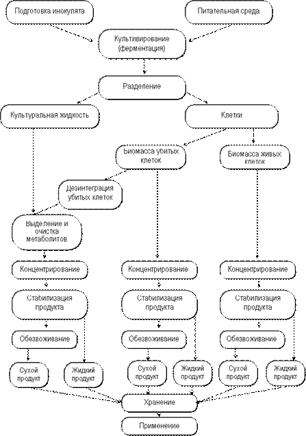 Большое разнообразие биотехнологических процессов, нашедших промышленное применение, приводит к необходимости рассмотреть общие, наиболее важные проблемы, возникающие при создании любого биотехнологического производства. Процессы промышленной биотехнологии разделяют на 2 большие группы: производство биомассы и получение продуктов метаболизма. Однако такая классификация не отражает наиболее существенных с технологической точки зрения аспектов промышленных биотехнологических процессов. В этом плане необходимо рассматривать стадии биотехнологического производства, их сходство и различие в зависимости от конечной цели биотехнологического процесса. В общем виде система биотехнологического производства продуктов микробного синтеза представлена на рис. 3. Существует 5 стадий биотехнологического производства. Две начальные стадии включают подготовку сырья и биологически действующего начала. В процессах инженерной энзимологии они обычно состоят из приготовления раствора субстрата с заданными свойствами (рН, температура, концентрация) и подготовки партии ферментного препарата данного типа, ферментного или иммобилизованного. При осуществлении микробиологического синтеза необходимы стадии приготовления питательной среды и поддержания чистой культуры, которая могла бы постоянно или по мере необходимости использоваться в процессе. Поддержание чистой культуры штамма-продуцента – главная задача любого микробиологического производства, поскольку высокоактивный, не претерпевший нежелательных изменений штамм может служить гарантией получения целевого продукта с заданными свойствами.