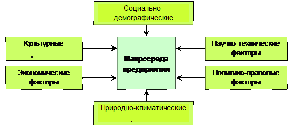 Макроокружение (макросреда, среда косвенного воздействия) создает общие условия среды, в которой находится предприятие. В большинстве случаев макросреда не носит специфического характера по отношению к отдельно взятой фирме. Однако каждая из них испытывает на себе влияние макросреды и не может управлять ею. Внешняя макросреда фирмы выступает как нечто заданное. Фирма не имеет возможности влиять на внешнюю среду и для эффективной деятельности должна приспосабливаться к ней, неустанно следить за ее изменениями, прогнозировать и своевременно реагировать. Циклические и структурные кризисы, инфляция, рост безработицы, нарушение условий товарообмена, а также отсутствие планирования использования природных ресурсов являются тормозящими факторами, которые оказывают негативное влияние нарост международного туристского обмена. Среда косвенного воздействия обычно сложнее, чем среда прямого воздействия. Поэтому при ее исследовании обычно опираются, прежде всего, на прогнозы.