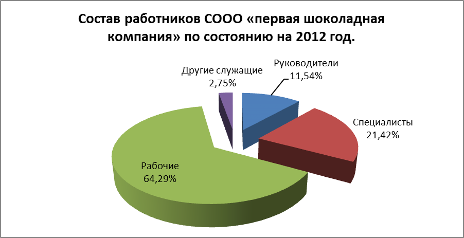 Организационно-штатная структура СООО «Первая шоколадная компания» состоит из 3-х цехов: Цех №1 – по производству шоколада, Цех №2 – по производству конфет, Цех №3 – по производству шоколадных масс и глазурей. Это производственная структура. РАЗБЕРИТЕСЬ! Директору фабрики подчинены: заместитель по производству, главный технолог с подчиненными ему технологами и инженером по качеству, главный инженер с подчиненными ему ведущим инженером по охране труда и технике безопасности, вед. инженером-энергетиком. В организационно-штатную структуру кроме производственного подразделения входит аппарат управления со службой маркетинга, отделом логистики, финансово-экономической службой, отделом автоматизации и программного обеспечения, ведущим юрисконсультом, ведущим специалистом по кадрам. Возглавляет СООО «Первая шоколадная компания» генеральный директор, которому подчинены 5 заместителей по направлениям деятельности, являющихся руководителями служб и отделов. Схема организационно-штатной структуры прилагается в приложении. На предприятии существует линейно-функциональная структура управления которая представлена в приложении Среднесписочная численность работников в 2012 году составила 149 человек, в том числе 9 человек находится в отпуске по уходу за ребёнком до достижения им возраста 3-х лет. Из числа работников - 93 человека или 62,4 % -женщины и 56 человек - мужчины. Указанные 182 работников по составу распределяются следующим образом: руководители – 21 человек, специалисты– 39 человека, другие служащие – 5 человека, рабочие– 117. Рис.3.1.Состав работников СООО «первая шоколадная компания» по состоянию на 2012 год. По уровню образования распределение численности работников выглядит следующим образом: имею высшее образование – 49 человека, среднее специальное – 44 человека, профессионально-техническое – 45 человека, общее среднее – 43 человека, общее базовое – 1 человек.