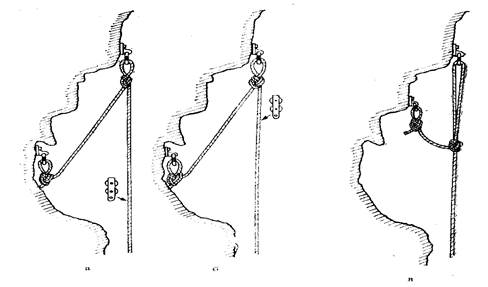 Для безопасности прохождения недостаточно, чтобы дублирующие крепления были только на оптимальном расстоянии одно от другого. Очень важно и то, как фиксировать веревку сообразно их взаимному расположению. Иногда в начале колодца, чтобы сразу вынести навеску от его стен, приходится основное крепление располагать над дополнительным. Если спусковое устройство встегнуть в веревку ниже дополнительного крепления (если встегнуть выше, это будет равносильно попытке самоубийства – рис.14б) и основное крепление разрушится, фактор падения не будет превышать 1 (рис.14а). Однако в этом случае мы не только нагрузим веревку до предела ее возможностей, но нагрузка полностью ляжет на дополнительное крепление, что недопустимо: если и оно разрушится, ничто больше не остановит падения. В таких случаях ниже уровня дополнительного крепления делают узел, а удлиненная петля фиксируется в основном креплении. Теперь, если оно разрушится, нагрузка как на веревку, так и на дополнительное крепление будет минимальной.