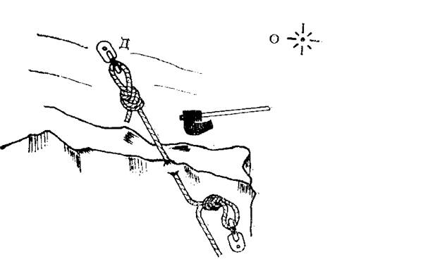 Рис. 15. Неправильно дублированное основное крепление: О – основное крепление; Д – дополнительное крепление В случае горизонтального дублирования при выборе мест для креплений надо мысленно проследить путь, который проделала бы веревка, пока нагрузится дополнительное крепление, если основное разрушится. При возникновении опасности сильного удара спелеолога о стену колодца, удара веревки или трения ее об острый край или скальное ребро необходимо искать другое решение. Date: 2015-09-27; view: 393; Нарушение авторских прав |