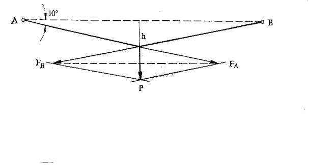 Вид хорошо натянутой веревки при навеске типа "троллей" создает чувство большей безопасности при передвижении по ней. К сожалению, это чувство обманчиво, потому что, чем сильнее натянута веревка, тем легче ей порваться под нагрузкой. Если, например, угол провисания равен 10 градусам, нагрузка в точках А и В (рис. 21) возрастает втрое, в чем уже кроется большая опасность. Почему так получается?