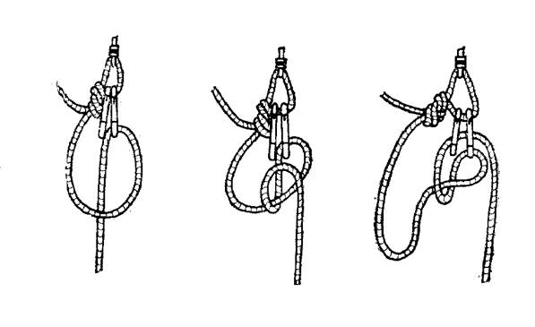 Самозатягивающиеся узлы. Применяются обычно в аварийной ситуации, когда какой–либо из самохватов сломался, потерся или не закусывает грязную веревку. Их прочность близка к объявленной прочности веревки, из которой они сделаны, потому что, как известно, здесь работает двойная веревка (см. п.6.1). Это позволяет с достаточной безопасностью использовать шнуры диаметром 5 и 6 мм. Из известных 18 видов самозатягивающихся узлов подходят для использования в технике одной веревки только четыре: классический самозатягивающийся узел "прусик", перекрестный самозатягивающийся узел, его карабинная разновидность "арб" и карабинный узел "бахман" (рис. 37). При необходимости число витков во всех узлах можно увеличить.