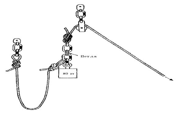 Проверять статическую веревку на пригодность к дальнейшему употреблению следует: – веревку d 9 мм – через 2 года; – веревку d 10 и больше мм.– через 3 года; – независимо от срока и даты последней проверки – для любой веревки, которая вызывает малейшее сомнение. С этой целью на удобной скале в районе клуба надо забить рядом друг над другом два крюка SPIT и занести туда подходящий груз весом 80 кг. От веревки, которую надо испытать, отрезают кусок длиной около 3 м и кладут в емкость с водой так, чтобы она хорошо пропиталась. На обоих ее концах вяжутся узлы "восьмерка" или (для веревки d 9 мм) "девятка", так что получается образец длиной примерно 1.5 м от петли до петли. Карабином "АэСМЮ" 3400, "Штубай" 5000 или треугольным карабином MR диаметром 10 мм готовый образец крепят к ушку нижнего крюка и грузу. Карабин, на котором висит груз, связывается сдвоенной петлей из тонкого шнура с карабином на веревке, переброшенной через блок, который крепится на втором крюке. С его помощью посредством полиспаста или мускульной силы нескольких человек груз поднимается, пока карабины в петлях образца не окажутся на одном уровне (рис. 50).