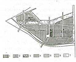 ташовують на межах із сельбищними територіями. У склад громадського центру слід включати заклади як ведучих функцій -управлінськіх, науково-проектних, інформаційного обслуговування, так і супроводжуючих - культурно-побутового обслуговування, громадського харчування, пунктів охорони здоров'я та інше. При відведенні територій промислових районів як спеціалізованої функціонально-планувальної одиниці міста необхідно враховувати такі планувальні чинники, як конфігурацію міського плану, мережу міських вулиць, рельєф, ландшафтні утворення і т.ін. Планувальна структура промислових районів і їхнє розміщення в місті мають різний характер у залежності від таких природньо-кліматичних чинників: рельєф місцевості, напрямок, швидкість і повторюваність вітрів, вологість повітря і т.д.; інженерно-геологічні характеристики території - рівень ґрунтових вод, несуча спроможність гірських порід, закарстованість, паводки і т.ін.; характер водяного балансу прилеглих водяних систем, можливість відведення і знешкодження стічних вод. Визначальними при розміщенні промислових підприємств є санітарно-гігієнічніхарактеристики виробництва, які у значній мірі впливають на умови формування промислових районів і всієї структури міста. У залежності від умов здійснення технологічних процесів, характеру і кількості викидів виробничих шкідливостей в атмосферу, створення шуму і вібрацій, електромагнітних хвиль і радіочастот, ультразвуку й інших негативних впливів з урахуванням заходів по мінімізації таких шкідливостей промислові підприємства за санітарною характеристикою діючими санітарними нормами (СН-245-71) поділяють на п'ять класів. До першого належать підприємства з найбільшими виробничими шкідливостями, до п'ятого — з виробництвами без викидів шкідливостей. Санітарними нормами для кожного вида виробництв (класу промислового підприємства за санітарною характеристикою) встановлюються розміри ширини санітарно-захисних зон - санітарних розривів. Санітарно-захисна зона – це територія між границею промисловоговузла чипідприємства і границею селитебной території. Санітарний розрив - це відстань від джерела шкідливих викидів в атмосферу до границі селитебної території чи іншого підприємства.Прийнята санітарна класифікація підприємств передбачає обов'язкове дотримання санітарних розривів і санітарно-захисних зон, а також гранично припустимих концентрацій шкідливих викидів в атмосферу. Промислові райони в місті за архітектурно-планувальними умовами і особливостями чинників, що впливають на їх формування, серед яких найбільш суттєвими виступають санітарна шкідливість виробництв і вантажообіг підприємств, діючими нормами поділяються на три містобудівні категорії, для кожної з яких призначений свій функціонально-адекватний склад розташованих у районах підприємств (рис.10.2). Першу категорію складають підприємства, що виділяють виробничі шкідливості та потребують залізничного транспорту,а також значного об'єму вантажообороту автотранспорту. Вони також характеризуються особливими умовами виробництва: пожеженебезпечністю, вибухонебезпечністю, радіоактивністю. До такої категорії належать великі металургійні, хімічні,