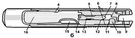 Рис. 26. Затвор (а – левая сторона, б – вид снизу). 1 – мушка; 2 – целик; 3 – насечка; 4 – зуб для постановки затвора на затворную задержку; 5 – паз для отражателя; 6 – продольные выступы для направления движения затвора по рамке; 7 – гребень; 8 – гнездо для предохранителя; 9 – паз для курка; 10 – выем для помещения разобщающего выступа рычага взвода; 11 – выступ для разобщения рычага взвода с шепталом; 12 – паз для разобщающего выступа рычага взвода; 13 – выем для разобщения шептала с рычагом взвода; 14 – досылатель; 15 – окно для выбрасывания гильзы (патрона); 16 – канал для помещения ствола с возвратной пружиной Внутри затвор имеет: канал для помещения ствола с возвратной пружиной; продольные выступы для направления движения затвора по рамке; зуб для постановки затвора на затворную задержку; гребень; паз для отражателя; паз для разобщающего выступа рычага взвода; чашечку для помещения дна гильзы; досылатель для досылания патрона из магазина в патронник; выступ для разобщения рычага взвода с шепталом; выем для помещения разобщающего выступа рычага взвода при нажатом спусковом крючке; на правой стороне гребня затвора имеется выем, предназначенный для разобщения шептала с рычагом взвода при снятии затвора с затворной задержки при нажатом спусковом крючке; канал для помещения ударника. Ударник (рис. 27) служит для разбития капсюля. Он имеет: в передней части – боек, в задней части – срез для предохранителя, который удерживает ударник в канале затвора.