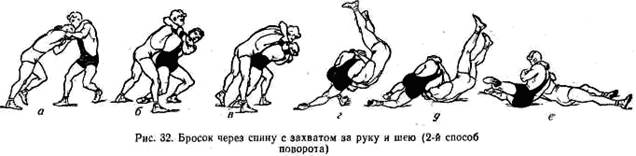Атакующий в правой стойке (рис. 32 — о). Левой рукой захватить правое плечо противника, а правой за шею. Повернуться к противнику спиной и перенести тяжесть тела на левую ногу (рис. 32 — 6). Продолжая поворачиваться налево, прижать противника грудью к своему правому боку, а шею правой рукой как можно плотнее в подмышечную впадину. Одновременно плотно удерживать левой рукой правое плечо противника (рис. 32— в). В процессе поворота спиной к противнику таз атакующего должен быть на уровне его таза или немного ниже. Поворачивать таз налево надо так, чтобы ягодичная мышца выходила за правую ногу атакуемого несколько больше, чем при первом способе поворота. Остальные движения в приеме такие же, как и при первом способе поворота (рис. 32 — г, д, е).