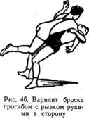 Захватить левую руку противника за плечо и подставить правую ногу на уровень стоящей впереди ноги (рис. 45— а). Одновременно захватить левой рукой туловище противника по линии пояса. Подсесть под противника, отклониться назад и подтянуть его в направлении к себе на грудь (рис. 45 — б). Если не удалось подтянуть противника к себе на грудь, атакующему следует сделать несколько шагов назад и во время движения подтянуть его на грудь. После отрыва-подбива сделать поворот грудью к ковру в сторону захваченной руки. В большинстве случаев поворот с таким захватом выполняется несколько ниже, чем при захвате туловища с рукой (рис. 45 — в). После поворота грудью вниз дожать противника с захватом руки и туловища, лежа на животе и расставив ноги в стороны (рис. 45 — г). Прием можно проводить с шагом вперед (зашагиванием), с зависанием на противнике, а также с рывком руками в сторону. При последнем варианте после захвата правой руки противника за плечо поставить сзади стоящую ногу к впереди стоящей ноге, послать свою правую руку под левую руку противника (под мышку) и пропустить ее как можно дальше. Падая назад, прогнуться, сделать сильный рывок руками вверх-влево-назад и бросить противника (рис. 46). При выполнении этого приема атакующий не подбивает противника животом снизу вверх, а падает назад почти на прямых ногах. Поворот грудью к ковру надо начинать одновременно с падением назад. Характерные ошибки. 1. Неплотное прижимание противника к своей груди. 2. Неодновременное движение головы назад, выпрямления ног, прогибание и рывок руками на себя. 3. При использовании последнего варианта бросок выполняется за счет подбива животом снизу вверх. Тактическая подготовка. Захватить правой рукой правое плечо противника, а левой его шею сверху. Используя выпрямление противника, выполнять бросок прогибом с захватом руки и туловища. Комбинация. Бросок через спину с захватом за руку и другое плечо сверху — Бросок прогибом с захватом за руку и туловище. Захватить левое запястье и правое плечо противника сверху. Сделать попытку провести бросок через спину с поворотом направо. Используя момент, когда противник отклоняет туловище назад, отпустить запястье, захватив правой рукой его туловище, и выполнить бросок прогибом. Защиты. Те же, что и от броска прогибом за туловище с рукой. Контрприемы. Вертушка с захватом за руку (см. стр. 281). Бросок прогибом. Накрывание выставлением ноги в сторону поворота. В момент захвата сползти назад-вниз и отставить назад правую ногу (или ногу, которая будет выставляться) (рис. 47—а). Если противник начинает прием, контратакующий поворачивается несколько направо, выводит таз и ногу в сторону накрывания (рис. 47 — б). В начале поворота контратакующий выставляет ногу (ноги) вперед-в сторону и, упираясь свободной рукой и правой ногой в ковер, не дает атакующему закончить поворот, задерживая его спиной вниз с захватом руки и шеи сбоку или руки и туловища (рис. 47— в, г).