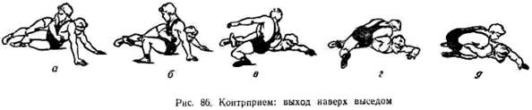 Защиты. 1. Плотно прижать туловище к своим бедрам. Руки, согнутые в локтях, прижать к туловищу. 2. Захватить кисти атакующего и не дать ему соединить руки на туловище. 3. Быстро лечь на живот и не дать атакующему возможности соединить руки на туловище. 4. Лечь на живот, плотно прижаться тазом к ковру и прогнуться в пояснице. Грудь и голову поднять вверх, широко расставленными руками упереться в ковер. 5. Отставить полусогнутую ногу в сторону наката и плотно прижать ее к ковру. Слегка развернуть грудь и голову к атакующему и поднять плечо вверх. Контрприемы. Выход наверх выседом. Как только атакующий соединяет руки для захвата за туловище, сделать быстрое движение вперед, перенести тяжесть тела вперед на руки и, не останавливая движения вперед, выполнить высед вперед-влево на правое бедро (рис. 86—а, б). Отталкиваясь от ковра левой рукой и распрямляя левую ногу, резким движением повернуться направо и послать правую руку под мышку противника (рис. 86—в). Если захват в это время разорван, то, продолжая движение вправо на партнера, перейти в положение верхнего (рис. 86—г, д). Если туловище остается захваченным, то надо сделать дополнительное усилие для разрыва захвата. Выпрямить туловище за счет распрямления левой ноги и поднятия таза вверх. Нажать правой рукой подмышку или плечо партнера и разорвать захват.