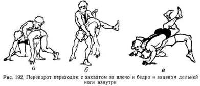Переворот можно выполнять не поднимаясь в стойку. При этом после захвата за бедро сзади-изнутри и шеи сверху-снаружи подсунуть правое колено под противника (рис. 193—а). Наклонить туловище вперед, приподнять захваченную ногу и тянуть ее в направлении головы противника. Одновременно зацепить правой ногой его правую ногу у колена (рис. 193—б). Толкаясь ногой, упасть через противника и перевернуть его на спину (рис. 193—в). Характерные ошибки. 1. Захват ноги выполняется за верхнюю часть бедра. 2. Атакующий падает через противника в перпендикулярном направлении, а не в сторону его головы и плеч. 3. Дожимая противника на лопатки, атакующий не поднимает зацепленную ногу вверх.