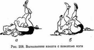 Переворот накатом с подбивом бедра или зацепом голени. Перевороты накатом в вольной борьбе можно усилить подбивом одноименного бедра снаружи или зацепом голени снизу (рис. 208—а, б). Накаты можно выполнять и с помощью захватов ниже пояса, а также захватов дальнего бедра сверху снаружи и изнутри.