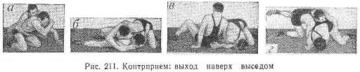Выход наверх выседом. Освободить ноги. Захватить одноименное плечо сверху (рис. 211—а). Толкнуть противника и сбить его на плечо (рис. 211—б). Сделать высед, повернуться направо, захватить за туловище или одноименное бедро снизу через одноименную руку. Опереться свободной рукой и ногами о ковер и выйти наверх (рис. 211—в, г). Переворот с захватом за запястье с выставлением ноги назад. Захватить за запястье на туловище снизу. Выставить ближнюю ногу назад (212—а). Опереться на выставленный вперед-под себя локоть. Сесть на дальнее бедро, повернуться налево, толкнуть левой рукой противника в грудь и перевернуть его на спину (рис. 212—б, в).