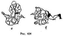 Противник лежит на спине, подняв ноги вверх. Атакующий стоит на коленях со стороны его ног. Захватить и положить на плечо у шеи разноименную ногу противника. Прижать его другое бедро к ковру разноименной голенью. Движением плеча вперед на противника и в сторону развести его бедра возможно шире и выполнить болевой прием. Применяются следующие варианты приема: с захватом ноги на плечо (рис. 432); с обвивом ноги и захватом другой ноги (рис. 433); с захватом голени под плечо, упираясь стопой в подколенный сгиб. Характерные ошибки. 1. Атакующий делает первое движение не вперед на противника, а сразу в сторону. 2. Ставит колено на бедро противника. 3. Прижимает к ковру не бедро, а голень ноги противника. Защиты. 1. Снять ногу с плеча атакующего. 2. Упереться руками в плечи атакующего и, отталкиваясь ногами, увеличить дистанцию. 3. Ногу атакующего столкнуть с бедра. 4. Ногу атакующего столкнуть из подколенного сгиба. Контрприемы. Рычаг локтя при помощи ноги сверху. Ущемление ахиллова сухожилия.