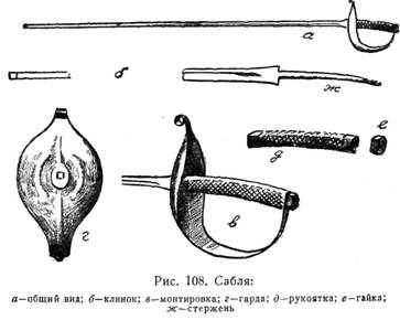 Сабля (рис. 108, а) — оружие, рубящее и колющее. Вес ее — от 325 до 600 г, общая длина не более 105 см. Клинок (рис. 108,6) в слабой части — плоский, а в средней и сильной — трехгранного сечения; обе узкие стороны плоской части клинка и узкая сторона средней и сильной части называются лезвиями. Противоположная лезвию утолщенная часть клинка называется обухом. Общая длина клинка без стержня («хвоста») —88 см. Клинок в боковой плоскости может быть выгнут, стрелка прогиба при этом не должна быть более 4 см. Монтировка (рис. 108, в) состоит из гарды (рис. 108, г,), рукоятки (рис. 108, д) и гайки (рис. 108, е). Гарда предназначена для защиты кисти от ударов и уколов. Диаметр гарды не более 15 см в направлении лезвия и не более 14 см в перпендикулярном направлении. Чаша гарды с одной стороны переходит в дужку. Рукоятка приспособлена для наиболее удобного держания сабли при нанесении и рубящих и колющих ударов. Сечение ее четырехгранное, длина (без гайки) не более 15 см. Плоская узкая грань ее немного изогнута и называется спинкой, а противоположная ей грань имеет закругленные ребра и называется брюшком. Гайка навинчивается на стержень (рис. 108, ж) клинка, продетый сквозь гарду и рукоятку, и скрепляет клинок с монтировкой.