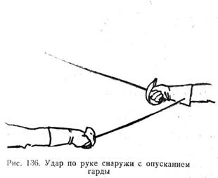 Удар по руке сверху (рис. 133), т. е. в вертикальной или близких к ней плоскостях, выполняется так же, как удар по голове. Однако низкое расположение цели (кисть или предплечье) позволяет производить этот удар без специального замаха и почти не поднимая гарды. Удары по руке сверху возможны при всех положениях руки противника, кроме пятой позиции. В зависимости от взаиморасположения клинков фехтующих они выполняются прямо или с переносом. Рубить руку сверху, когда рука противника закрыта гардой, следует как бы из-за угла, т. е. вынося свою кисть вправо и создавая между клинком и рукой угол вершиной вправо или поднимая свою кисть вверх и обходя клинком гарду противника сверху, т. е. создавая угол с вершиной в лучезапястном суставе, обращенной вверх. Удары по руке снаружи. Эти удары являются наиболее употребительными, что объясняется физическим удобством их выполнения и сравнительно менее трудной защитой от ответного удара в случае их неудачи. Снаружи рука рубится так же, как правый бок (рис. 134). В зависимости от положения вооруженной руки противника бывает выгодно рубить руку з наклонных плоскостях движением клинка сверху вниз-направо и снизу вверх-вправо. Последнее направление рубки применяется обычно из положения опущенного оружия. Удар может выполняться и круговым движением, как при рубке левого бока, но максимально узко и без переноса клинка противника. Применяется в бою удар по руке снаружи и с переносом, выполняемым полукруговым движением клинка вверх-влево, вниз-направо. Кроме того, при высокой и устремленной вперед третьей позиции противника бывает выгодно рубить руку снаружи с опусканием гарды вниз, в силу чего клинок, обходя гарду, получает доступ к руке (рис. 135).