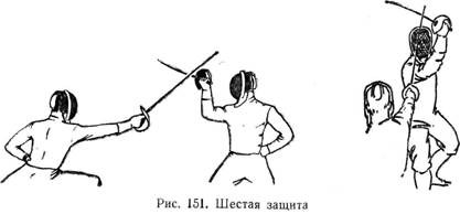 Шестая защита (рис. 151) закрывает голову, грудь и руку от ударов сверху. Из третьей позиции и близких к ней положений шестая защита выполняется прямым движением гарды вверх-влево до уровня лба, но левее его с одновременным супинирующим поворотом кисти до положения клинка лезвием вверх-вперед, как в шестой позиции (см. рис. 122, б).