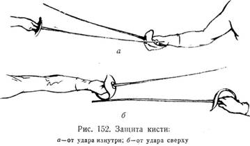 Защиты кисти и предплечья у кисти по сравнению с защитами туловища и головы совершают более узкими перемещениями оружия в сторону угрозы и более полным поворотом гарды дужкой к клинку противника (рис. 152, а, б,). Рука может быть предохранена от удара и посредством взятия ее на себя, отводя локоть назад к правому боку и далее за него снаружи. Взятие руки на себя может сочетаться и с защитой ее оружием. Возможные ошибки при выполнении защит: 1) стремление встретить клинок атакующего противника преждевременным, чрезмерно широким и ударным движением оружия; 2) нечеткая и опаздывающая постановка клинка лезвием против оружия противника; 3) отставание клинка от движения гарды.