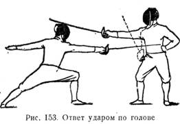 В фехтовальном бою на саблях момент после взятия защиты всегда очень выгоден для нанесения удара вследствие близости и большой открытости противника. Поэтому чаще всего ответы выполняются немедленно после защиты с максимальной скоростью и по ближайшей, наиболее открытой части тела противника (в пределах поражаемого пространства). Ответы делают не только прямые, но и с переносом и переводом. Кроме того, возможны ответы с выдержкой и обманными движениями оружием. Сами удары и уколы в ответах по технике немногим отличаются от таковых в атаках, но выполняются они обычно на месте — без выпада или с коротким выпадом или в момент отхода назад. Кроме того, исходные положения оружия при ответах, т. е. конечные положения защит, позволяют почти всегда выполнять удары без специальных замахов, а близость к чрезмерно глубоко атаковавшему противнику позволяет нередко производить удары без полного выпрямления руки. Наиболее выгодными ответами являются следующие: после четвертой защиты — удары по руке снаружи и сверху, по правой щеке, по голове (рис. 153), по левому боку; после третьей защиты — удары по голове, по левой щеке, по руке снаружи, укол прямо; после второй защиты — удары по правой щеке, по руке снаружи, укол прямо; после пятой защиты — удары то голове, по правому боку, по левому боку, укол переводом; после первой защиты — удары по руке сверху, по голове (см. рис. 125), по всей правой стороне тела противника в пределах поражаемого пространства; после шестой защиты — удар по левому боку.