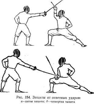 Защиты от ответов в фехтовальном бою на саблях представляют еще большую трудность, чем в фехтовании на рапирах. К необходимости атакующему защищаться, яаходясь на выпаде и при отдаленном от себя своем оружии, прибавляется новое затруднение в виде крайнего разнообразия возможных ответов и одинакового технического удобства нанесения ударов по разным частям поражаемого пространства. Если в фехтовании на рапирах от самого быстрого и самого вероятного ответа уколом прямо может быть взята преднамеренная защита, то в фехтовании на саблях осуществление преднамеренных защит встречает затруднение, так как в этом виде фехтования нет в такой же мере предпочтительного, наиболее вероятного ответа, каким является укол прямо в фехтовании на рапирах. Тем не менее, конкретная защита от увиденного в ответе оружия противника, несмотря на большую трудность ее выполнения, должна занимать весьма значительное место в тренировке фехтовальщика в защитных действиях. Овладение этой защитой в широком ее применении имеет большое моральное значение во время ведения боя, являясь как бы аварийным запасом на случай временной потери «чувства» боя. Пытаясь защититься от ответа, атаковавший, почувствовав защиту противника, должен немедля начинать уход с выпада, назад, чтобы удлинить время, необходимое для выполнения ответного удара-укола, и тем самым получить большую возможность защититься от него. В этих случаях защиту от ответа приходится принимать на полпути возвращения в боевую стойку, т. е. в одноопорном положении, что не должно отрицательно влиять на правильность защитных движений оружием. При необходимости защищаться от ответа в положении выпада или в начале ухода из него назад саблист вынужден сопровождать выполнение защиты значительным взятием оружия на себя. В конечных положениях защит в этих случаях оружие оказывается сильно приближенным к защищаемому месту (рис. 154, а, б). Защита от ответа должна завершаться контрответом. При отпарированной атаке броском защиту от ответа следует выполнять на бегу, что обыкновенно приходится на начало первого стопорящего шага (рис. 155). За защитой от ответа на атаку броском как всегда должен следовать контрответ, так же, как и защита от ответа, совершаемый на бегу. Преднамеренная защита в ложной атаке легко осуществима и приносит положительный результат в бою с саблистом, страдающим привычкой при непреднамеренно взятой защите всегда отвечать одним и тем же ударом. Так, например, зная о привычном применении противником в ответах ударов по голове, атакующий саблист, почувствовав неожиданно соприкосновение своего клинка с клинком противника, взявшего какую-то непреднамеренную защиту, может смело, не ожидая того момента, когда можно будет увидеть направление движения оружия в ответе, принимать положение пятой защиты и, получив удар по оружию, отвечать. Зная об устойчивой привычке противника после пятой защиты отвечать по левому боку, атаковавший, встретив оружие противника в пятой защите, должен немедленно принимать положение четвертой защиты и, получив право на ответ, отвечать и т. д. Непреднамеренной, безотносительной защитой «на всякий случай» от ответа противника в фехтовании на саблях является пятая защита, поскольку явное преобладание в современном фехтовании на саблях защит с острием выше гар
