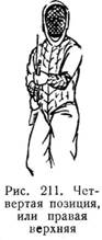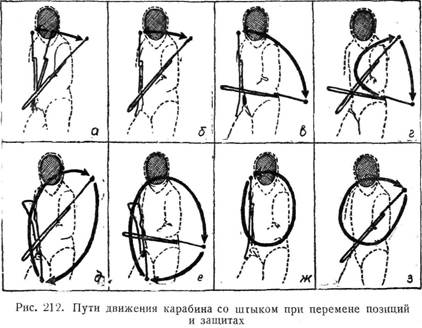 Третья позиция, или левая верхняя (рис. 210). Положение оружия аналогично боевой стойке, но острие штыка находится против правого уха, а не против левого глаза. Четвертая позиция, или правая верхняя (рис. 211). Оружие находится в четвертом секторе. Конец штыка против правого плеча на уровне подбородка. Карабин расположен вдоль правой границы поражаемого пространства, магазинная коробка направлена вниз. Левая рука в сравнении с основной, третьей, позицией незначительно выпрямлена, правая без существенных изменений. Часто применяется в целях вызова — приглашения. При всех позициях положение корпуса и ног фехтовальщика остается неизменным. Следует помнить, что позиция в колющих видах оружия сама по себе не закрывает ни один сектор поражаемого пространства. Перемена позиций может совершаться по кратчайшим прямым путям и но путям защитных движений карабина, обеспечивающих отбив оружия атакующего противника. Поэтому, чтобы закрепить защитные навыки, перемены позиций в курсе начальной подготовки фехтовальщика следует производить по путям принятия защит (рис. 212), о технике которых будет подробно сказано ниже.